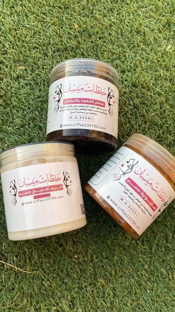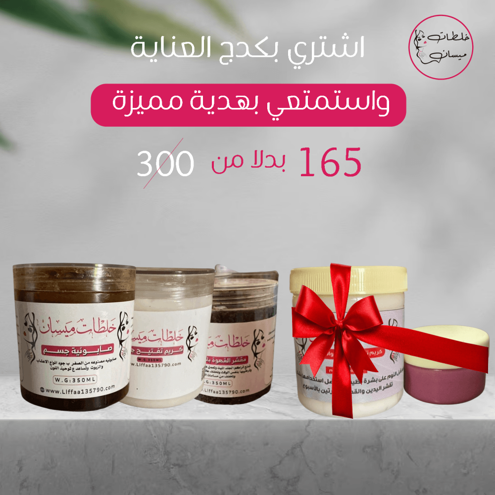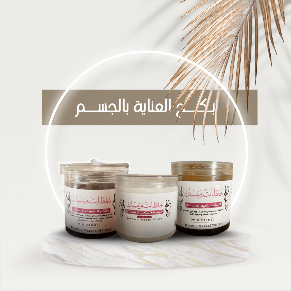 بكج العانية بالجسم المكوّن من مقشر القهوة الطبيعي بالأعشاب، وصابونية الجسم الفاخرة، وكريم تفتيح الجسم الفائق الجودة، لتجربة حقيقية في العناية بجسدك احصلي عليه الان من خلال متجرخلطات ميسان